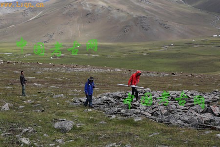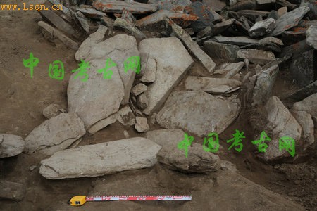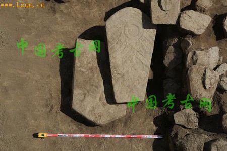 今年发掘的是花海子北部湖边的一个大型石围石堆遗址,巨大的石圈直径约76米,中间围着一个直径约36米的石堆,石堆为不规则圆形,厚约1米,基本和地表平齐。根据尺度,为三海子地区第三大的遗存,和第一大、第二大的遗址大致呈一条直线分布,其中最大的位于河流的东侧,第二大和第三大的遗址位于河流的西侧。均接近三海子地区最主要的水源。这种分布应当蕴含有古代人特别的意图。石堆东南部有平面略呈等腰三角形的石堆,像一条鞭子,尾端断续向东南延伸,和外部的石围相连。石堆西北边缘,有一条石块铺成的辐条,断断续续从中部石堆边缘连到外部石圈。可能过去的地震或者特殊原因导致了塌陷,整个石围石堆的北部近四分之一的部分已经坍塌,原来的石堆边缘和外部的石围现在已经沉陷于花海子湖中,又经湖水不断的侵蚀,继续加重遗址的沉陷。石堆西北边缘地表现存一通剥蚀严重的鹿石,考古队又从沉入湖水中的石堆西北边缘处,打捞出一通保存完好的鹿石。