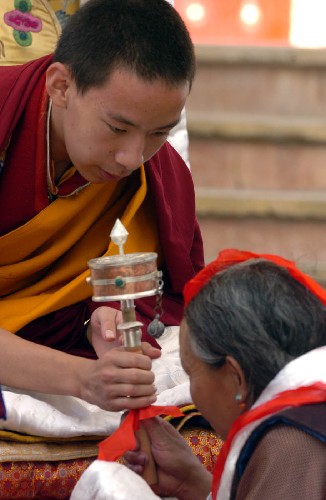 9月7日,十一世班禅为信徒的转经筒加持。当天,十一世班禅额尔德尼·确吉杰布在日喀则新宫德庆格桑颇章为藏族广大信教群众摸顶赐福,并赐予十一世班禅画像和经班禅加持的红色金刚结。 摸顶是藏传佛教中活佛高僧为僧人和信众赐福、消灾、避难的一种宗教仪式。当天是十一世班禅坐床以来在西藏第三次大规模地为信众摸顶赐福。 新华社记者格桑达瓦摄