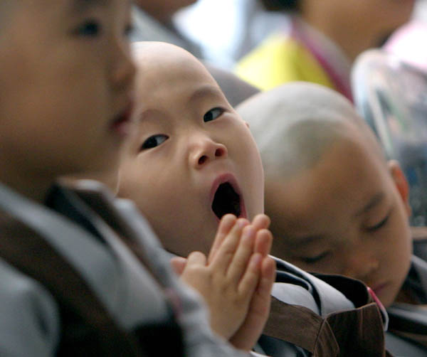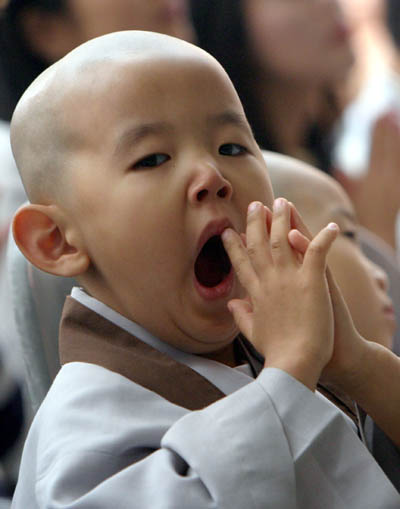 一群韩国小和尚在Chogye寺庙的周年庆典仪式上哈欠不断。