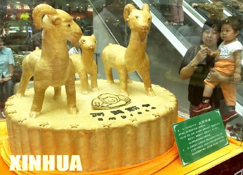 9月13日,一对母女被月饼“巨无霸”吸引。当日,一块重280公斤的月饼“巨无霸”在沈阳某商场展出。这块名为“三阳开泰”的大月饼,直径1.28米,高为0.98米,由六位特级面点师经过七天的时间制作完成,耗资1.5万元。 新华社记者谢环驰摄