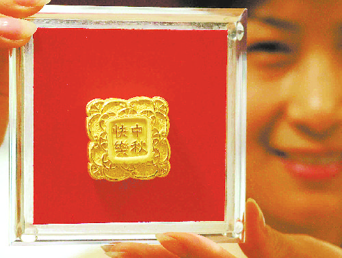 日前,合肥市一老牌金店售出由纯金做成的“月饼”。这只金“月饼”重9.5克,售价1843元。(江淮晨报记者 刘兵生 摄)