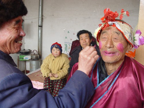 2月6日,山东省阳信县流坡坞镇前菅村86岁的“哈拉虎”表演者菅长志在演出前化装。民间曲艺“哈拉虎”又称牛骨子戏,600多年前传入阳信县流坡坞镇前菅村并流传至今。目前,当地政府开始对“哈拉虎”进行挖掘整理,为濒临失 传的“哈拉虎”重放异彩创造条件。