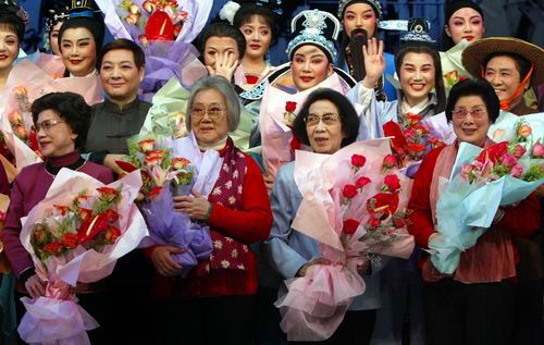 3月28日,演出结束后,老一辈越剧表演艺术家与演员合影。当日,“纪念中国越剧百年名家、精曲演唱会”在上海逸夫舞台举行,这是上海纪念越剧百年华诞系列活动中的一项。新