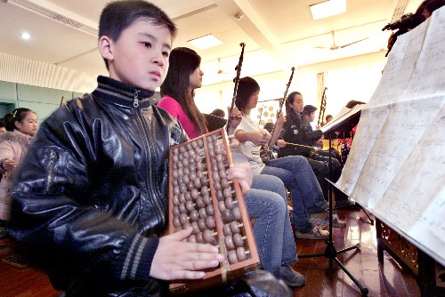 2月8日,一名男孩在用算盘作为打击乐器演奏民乐。当日,杭州少儿艺术团民乐团的孩子们为即将举办的“杭州少年新春音乐会民乐专场”进行排练。传统的算盘将首次作为打击乐器出现在特色表演曲目中,演奏者以拨、搓、拍 等手法配合全曲,营造出独特的音律节奏和声响效果。