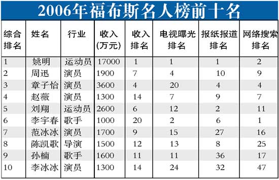 去年的福布斯排行榜上,王菲和李亚鹏还分列第5和第56,收入分别为2200万元和350万元人民币。但今年的名人榜上,两人100强却不入。其实去年媒体围着两人结婚生子“转”足一年,理应可以上榜,为何双双落选呢?至于徐静蕾近期可谓风光无限,凭借徐博客突破千万的点击率,以及在博客上与韩寒调情等绯闻,频频赢得高曝光率。无奈心思花在了博客上,影视剧缺少新作,徐静蕾综合排名仅列第18位,收入也只有800万元。