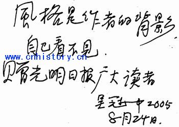 临别时,我请吴先生为本报广大读者写一句话。他说刚好在思索有关风格的问题,便工工整整地写道:“风格是作者的背影,自己看不见。”