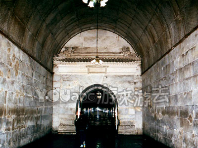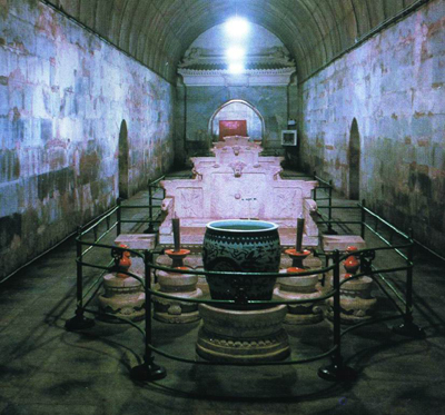 一盏汽灯照亮了地宫墓道。这是一间长方形大厅,全部用石条砌成,没有横梁和立柱,完全采用中国建筑所特有的起券形式,整座大殿显得格外宽大辉煌。考古者把这段建筑称为“前殿”。