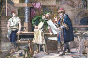 1450年,德意志人古腾堡(右一)改良了中国的活字印刷术