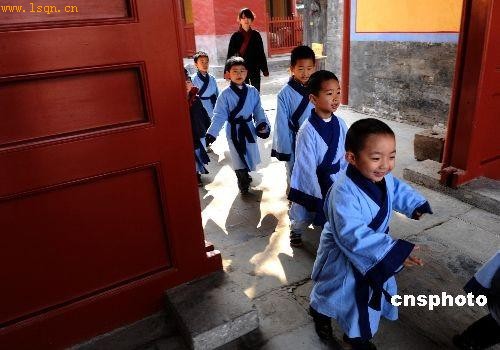 4月4日,北京国子监,小朋友们穿着传统服装祭祀孔子。当日,“过节日 习礼仪——清明时节话传统”活动在国子监举办。 中新社发 廖攀 摄