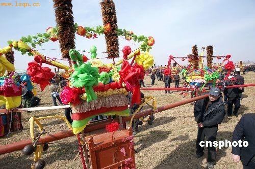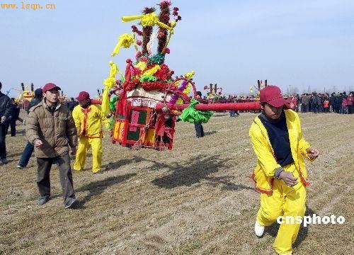 2009年2月15日是农历正月二十一,河北省南和县贾宋镇举办了盛大的民俗活动“抬皇杠”,贾宋镇上千村民参加了表演。河北省南和县“抬皇杠”从东汉末年黄巾起义时邢台一带的百姓为黄巾军送军粮而流传下来的,大约每十年抬一次杠,正月十五十六、十八十九、二十一和二十二都有,延续千年至今。中新社发克家摄
