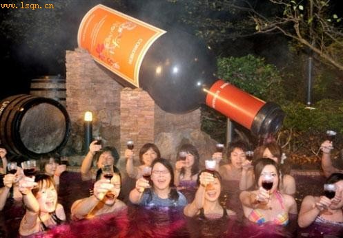 资料图片:日本办美酒温泉浴 众男女鲜葡萄酒中浪漫共浴