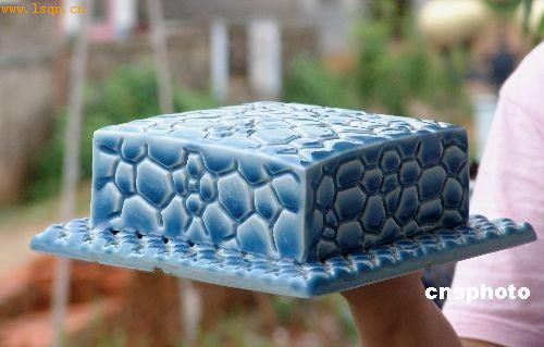 6月26日,景德镇高温窑变色釉瓷器“水立方”系列作品。近日,由江西景德镇陶瓷工艺高级工程师邓希平创作的高温窑变色釉瓷器“水立方”系列作品问世。这套作品分为水立方模型、瓷器花插、笔筒等,有天蓝、湖蓝、海蓝三种色彩系列,通过1370度高温窑变,在瓷器上体现“水立方”的立体感。 中新社发 石卫明 摄