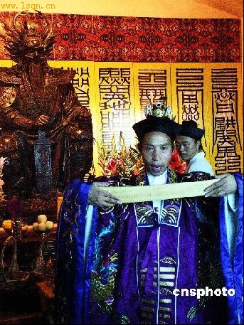 2004年八月二十一日,一座高一点九米、重一吨的南海龙王铜铸原身像,在三亚大小洞天旅游区南海龙王别院安座,彰显中国民间南海主权意识。该像珠发长须,人身龙甲,着战袍,扶宝剑,足踏双蛇,威猛庄严。中国道教全真龙门派第二十三代弟子、武汉长春观任宗权道长为南海龙王原身像安奉作道场。据悉,大小洞天位于南海之滨,背靠中国南方山脉之余脉鳌山,山海相连,洞天福地。早在南宋即辟为游历胜地,被推为琼崖八百年第一山水名胜,历代题刻,道家文化氛围浓厚。 中新社发 关向东 摄