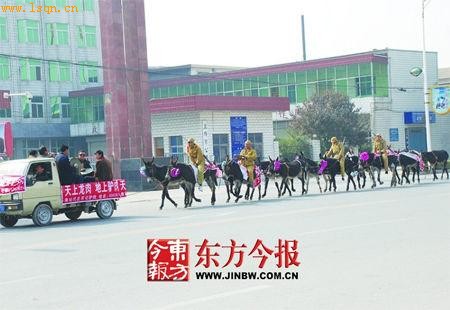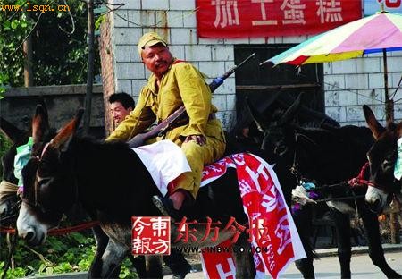 这支“耀武扬威”的队伍由四名身穿日本帝国主义军装、骑着毛驴的男子组成,由于他们牵的毛驴有十多头,所以队伍有二三十米长。在队伍前方,一辆面包车上还有一支乐队,唢呐声、镲钹声不绝于耳,场面着实壮观。