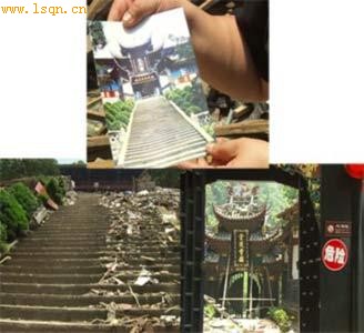 记者:“二王庙始建于南北朝时期,是为了纪念李冰而建筑的一个非常著名的建筑,它52级台阶、大殿、副殿来共同组成的,我们看到地震发生之后,这里面已经成了一片废墟。”