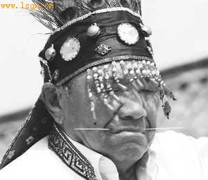 昨日13时许,天气放晴,在牧情谷旅游风景区神鹰山上的祭坛表演场内,当穿着“神服”,佩带沉重腰铃,手拿鼓和马叉的70岁老人石宗祥在助手的陪同下出场,整个表演场马上静了下来,所有人的目光全部集中在这位年迈的萨满身上。石宗祥一开始跪倒在地,有节奏地敲响鼓,伴随着鼓的韵律,石宗祥哼唱起了苍凉而又极具韵味的“神曲”……