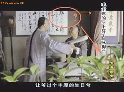 乾隆年间的民居书房,为官清廉的钱沣正在作画,墙上挂着一幅书法作品,上面居然草书着毛主席的《卜算子-咏梅》,这一幕出现在央视国际频道播放的古装电视剧《大清御史》的画面里。