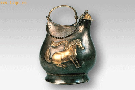 此壶仿游牧民族的皮囊式水壶造型,舞马衔杯纹则印证了唐玄宗时曾驯养良马隨乐起舞的歷史记载,极具歷史和艺术价值。