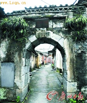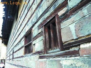 大桥镇里用于防盗的砖夹木墙壁。