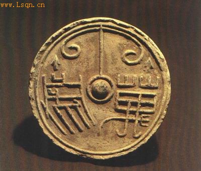 圆形,三角缘,缘内饰一圈凸旋纹。当心浮印一圆泡,泡两侧印篆体阳文“万岁”两字。字上部附饰文树纹。泥质浅黄陶。
