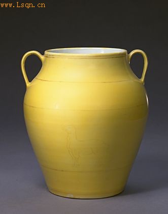 我国传统低温黄釉瓷器以明弘治时产品最负盛誉。由于弘治黄釉瓷器一般用“浇釉”的方法施釉,故有“浇黄”之称,又因其黄色浅淡娇嫩,故亦称“娇黄”。明代黄釉瓷器以盘、碗居多,黄釉描金罐唯弘治朝有。此类黄釉描金罐除置曲带式耳者外,尚有置兽耳者,也有不置耳的,均属宫廷祭祀用器。其传世品多属清宫旧藏。