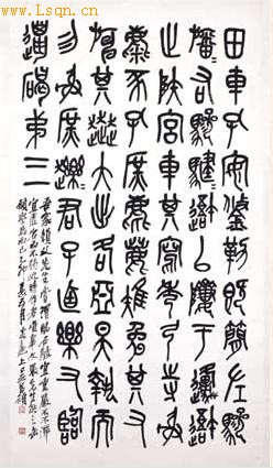 吴昌硕书,纸本,纵149.5cm,横82.3cm。 释文: 田車孔安鋚勒既簡左驂 旙旙右驂騝騝以于原 止宮車其寫秀弓寺射 麋豕孔庶麀鹿雉兔其又 何其大出各亞旲執而 勿射庶麋豕君子逌樂右臨 獵碣第三 吾家賴父先生嘗謂:臨石鼓宜重嚴不(而)不滯, 宜虛宕而不弱,近時作者唯臯文張先生能之,缶 願學焉而已。乙卯夏五月客滬上,吳昌碩。 本幅临石鼓第三鼓“田车”篇,末款“吳昌碩”,下钤“俊卿之印”、“昌碩”印二方。此轴书于1915年,吴昌硕时年71岁