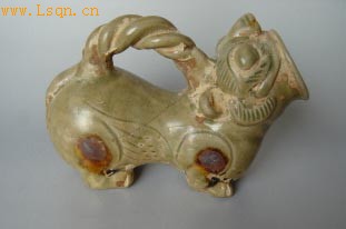 釉青色。器身作伏兽状,背部提梁作绳索形,四足作蹲式,头部正面塑眼、耳、鼻,头作昂首状,口部作流。腹部中间阴刻羽翼纹,四腿部分别饰褐色点彩。(有冲线)