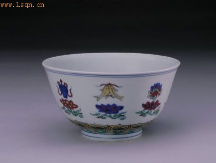 高8.7cm,口径16.5cm,足径7.1cm。 碗撇口,深弧腹,圈足。外壁斗彩装饰。腹部绘8组折枝莲托八吉祥纹。近底处绘变形莲瓣纹。圈足内施白釉。外底署青花楷体“大明万历年制”双行六字款,外围青花双方栏。 此碗是佛前供器,造型和纹饰均模仿成化斗彩瓷器,形制秀美,纹饰简明,色彩艳丽。 明万历朝斗彩器物不多,其器形及纹饰仍宗奉成化斗彩,但与成化斗彩相比,其色彩更为艳丽。 八吉祥属于藏传佛教使用的八种吉祥物,即法轮、法螺、宝伞、白盖、莲花、宝罐、金鱼、盘肠。