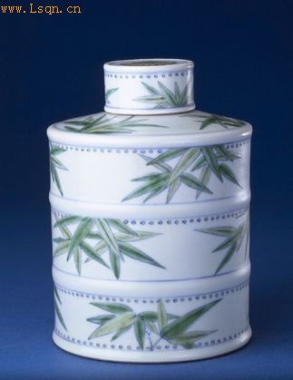 通高16.7cm,口径4.2cm,足径11.7cm。 罐小口,直颈,斜平肩,圈足,带盖。罐身以凸弦纹为界分成三段竹节式。器盖亦竹节形,上、下缘凸鼓,盖顶以覆彩技法绘团菊纹,黄蕊红瓣。器盖及罐身竹节处均以连珠纹装饰成竹根点斑,通体绘多组竹叶纹,竹叶填绿色淡彩。底双圈内书青花“大清康熙年制”双行六字楷书款。 装饰上大量使用单一色彩属于斗彩瓷器中的特殊品种。单一色彩在明成化年间的斗彩瓷器中已有所见,康熙斗彩中单一色彩器物的制作则更趋精致,并具清新雅淡之趣。
