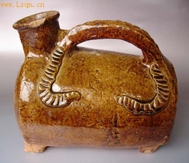 两端皆微向外鼓,前端较阔,后端微向下斜收,前端上部有一斜直圆筒形口,器身有一方柱形拱形提梁。背部靠近提梁前后两端处两侧各饰有一短直条状兽尾形堆加物。施褐釉,釉面光亮润泽。
