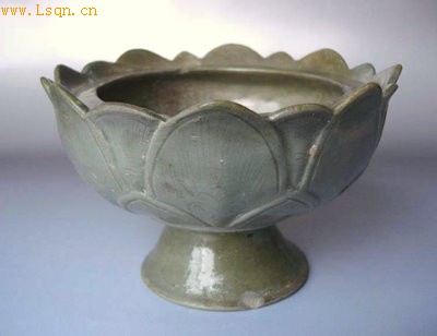 平口,口微内敛,弧腹,高足,足呈喇叭状。整器外壁饰三层莲瓣纹,近口沿处莲瓣突起一周呈高低起伏状。内外施青釉。