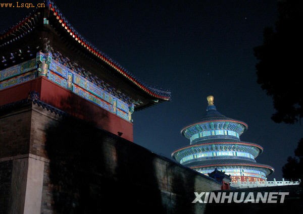 夜色中的祈年殿(右,10月5日摄)。国庆长假期间,北京天坛公园开启夜景照明,古老的建筑在灯光的映衬下更显雄伟壮观,也为节日的首都增添了喜庆氛围。新华社记者公磊摄