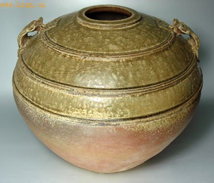 小口内敛,平沿,圆腹外鼓。肩部两侧贴塑有兽面形双耳,双耳下端又贴塑一半圆形环状物。器上部饰有弦纹三组,上两组弦纹对上又分别刻划有两组鸟纹。纹饰华丽精美,刻划流畅。