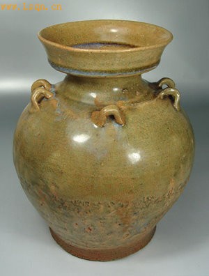 盘口,圆唇,短颈,溜肩,圆鼓腹,下腹内收,平底。颈部两侧各饰有一横状方形桥系,另两侧各饰有方形桥系一对,呈对称分布。施青釉,釉水青绿,釉厚处有积釉现象,釉面光泽细腻。