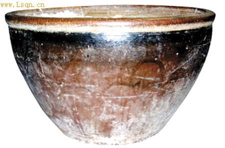 成化纪年墓出土白地黑花瓷缸 1997年春西安南郊曲江宾馆工地明墓出土。口径34厘米,底径16厘米,高62厘米。造型呈直口、圆唇、斜弧腹、内收,深腹、平底,外壁施白色化妆土,白色透明釉下绘黑花,形成白地黑花,下腹有旋成竹节纹。黑花绘于瓷缸上腹,上下用黑色宽带和细线分隔,其内为两组相同的纹饰,中心为变形莲纹,周围饰以散布涡纹和花叶纹。缸内施褐釉,上部拍印篦纹,似水波涌动。口沿内外不施釉,黄白胎,胎质稍显粗糙。属于明代耀州窑陈炉窑区制作,具有浓郁的民间工艺韵味。