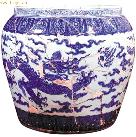 弘治纪年墓出土的白地黑花加彩绘龙纹瓷缸 1999年8月西安市南郊雁塔区明代弘治九年墓出土,墓主为汧阳端懿王朱公鏳。高62厘米,口径40厘米,底径19厘米。造型为直口、圆唇、束颈,上腹微鼓,腹壁向下渐收至足部、圈足。内壁施酱黑色釉,外施白釉,釉色微黄,腹部上下各有5道黑色釉彩描绘的弦纹,其间绘制有变形卷枝花叶纹饰,口沿及足底无釉,瓷缸表面另涂有一层白色粉底,其上绘制艳丽的云龙图案,可看出有粉红、黄色、浅绿等颜料。由于彩画剥蚀、脱落比较严重,龙的腹尾部比较清晰,其他部位已不易辨识。
