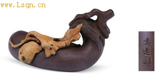 说明:水注仿茄子形。茄子自然弯曲,上翘的茄梗就是水注的出水孔,气孔则隐藏在扁豆叶之下。茄子以紫泥制成,茄子之上还俯有带着枝叶的扁豆,扁豆以黄色的段泥制成,扁豆之上还留有虫蛀痕,其中一颗扁豆只剩下一半,漏出里面的豆子,形象逼真而构思奇巧,极具想象力。这种象生器,也是文玩紫砂,相对于松竹梅等文人喜爱的立意清远的传统题材,陈鸣远的这种以瓜果蔬菜制成的文玩,因具有浓郁的田园气息,更接近自然、贴近生活,反而更为受到人们的喜爱。