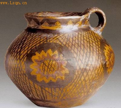 新石器 彩陶网格葵花纹单耳罐(马家窑文化马厂类型)