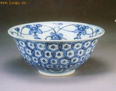 高7厘米、口径15厘米、底径5.7厘米。 侈口,深腹,圈足,釉色青白,青料呈色鲜艳,略见铁结晶斑。外壁满绘互联的钱纹,胫部为一周变形莲瓣纹,内壁饰花瓣,古钱和璎珞组合图案一周,碗心为以钱纹为花心,外围七个变形莲瓣组合的团花纹。此碗为景德镇窑空白期瓷器的典型作品。