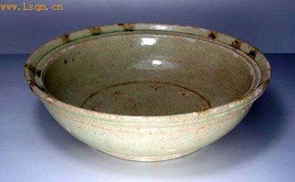 大盘口,弧腹,平底。口沿饰弦纹。施青釉,釉水青中泛绿,口沿饰有褐色点彩。