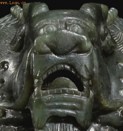 李教授同时指出此次拍卖的“八徵耄念之宝”印龙爪、头部纹饰雕工疲弱而少章法、刀法。龙的发纹不上冲,火焰纹并不上扬,龙爪粗野乏力、没有抓力,缺乏动感,似走兽类卧伏在地面一般,龙脊拱沿处造型用,用刀不干净表现无弧势,显出臃肿、毫无生气,因造型力度没把握好,鼻部中轴整块竟不居眼、口正中,电脑图片放大后看到门牙和边牙竟上下锯裂,此应为机雕出了差错留下的残缺,龙的形状与面部表情呈惊恐状,毫无龙威,粗糙得象砖雕,更无皇家气象(图五)。而拍卖玉玺竟煞有介事地配了个底坐“以旧充好”,以示此玉玺大有