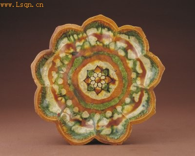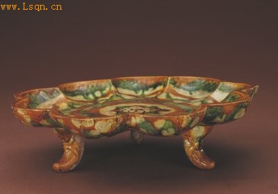 唐三彩陶器在艺术上最成功之处,在于突破了以往单色釉的局限,而运用多种釉色装饰器物,从而取得华丽动人的效果。唐三彩釉面装饰图案主要有网状、散点、彩带等。这些图案的表现手法不一,或利用釉彩的自然流动,或用毛笔沾釉汁描绘图案,或模仿唐代丝织品中的蜡染工艺等。这件花瓣式三足盘就是以模仿唐代丝织品中的蜡染工艺为装饰特色,这是唐三彩釉面装饰中最独特的一种工艺。它在制作时以蜡封住器物上欲装饰的部位,然后通体罩釉,蜡封处便不沾釉,这样就能保留原有的白色胎体,形成形状各异的图案。