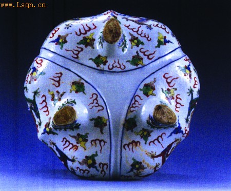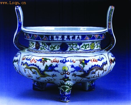 炉的视觉中心为三幅开光的双龙戏珠图案,六条五爪金龙,腾云驾雾;红黄绿青蓝紫,色彩缤纷。每幅双龙图案上的龙色彩都不同,它们交叉配色,变化多端,如龙身红色,龙头为黄色;龙身绿色,龙头为紫色;龙身黄色,龙头为青色;龙身绿色,龙头为红色等。宝珠呈红色和黄色。神龙上下,祥云缭绕,整个图案色彩艳丽、丰满大气。