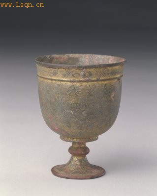 高7.5cm,口径5.9cm,足径3.5cm。 杯铜质,通体鎏金,高圆足。杯身以细线刻人马狩猎图,近口处饰弦纹一道。 唐代酒器多以金、银制品为首选,此缘于统治者对金、银制品的偏爱和社会的富足使得当时金、银铸造业空前发达。此杯镌刻精致,纹饰生动,且受到西域工艺风格的影响。