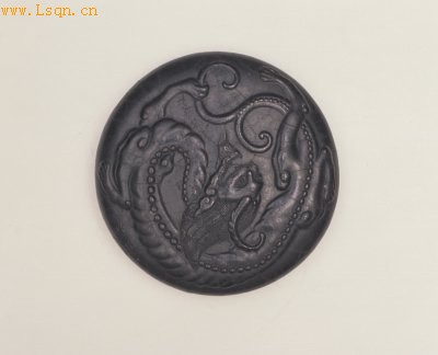 直径8.8cm,厚1.6cm。 墨圆饼式。中部凸鼓,至边缘缓迤圆转。正面雕一螭,随墨形屈卷,张口怒目。腹、尾之隙间刻阳文楷书“君房墨”三字款,近缘处刻阳文楷书“非烟”二字。背面雕4条小螭相互蟠绕,口衔或足踏灵芝。 此墨系典型的明代墨品。其以深刀阴雕墨模,刀法简洁流畅,纹饰精美生动,所雕螭体粗健浑圆而不臃,这种饰纹风格被前辈鉴赏家称为“珠圆玉润”,与锋棱峻整的雕刻风格并行于明代晚期。
