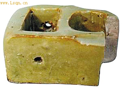 笔者在拍摄民间收藏的西安城市基建所出古瓷标本时,在一藏友处拍摄到一件宋代耀州窑青瓷墨斗,残长10厘米左右,保存了安置绕线木轮的长方形线轮槽,墨槽为圆形,两槽间有出线孔连通,线轮槽两壁开有轴孔,轴孔处带有磨损痕迹,但是墨槽的牵出孔部分已经残失。当时笔者是第一次目睹宋代耀瓷中有这类青瓷制作的营造工具,惊奇不已。此后在河南郑州藏家冯志刚处,再次目睹一件宋代青瓷墨斗标本,据介绍该标本出自河南汝州大峪东沟窑,造型比西安面世的耀瓷墨斗稍完整一些,墨池为四出花瓣形,保留了墨线牵出口的一部分,在这件墨斗上还留有粘烧痕迹,说明烧造时产品装窑较密集。有意思的是,西安与河南的这两件青瓷墨斗虽然不是一窑烧造,造型却近似,在墨池两边各切削出一条斜棱,可能是为了方便手持。另据冯志刚介绍,他收藏的河南古瓷标本还有黑瓷与白瓷墨斗。从西安与河南都出土过同类青瓷墨斗来看,这类瓷质的匠作工具在历史上确有一定数量烧造。