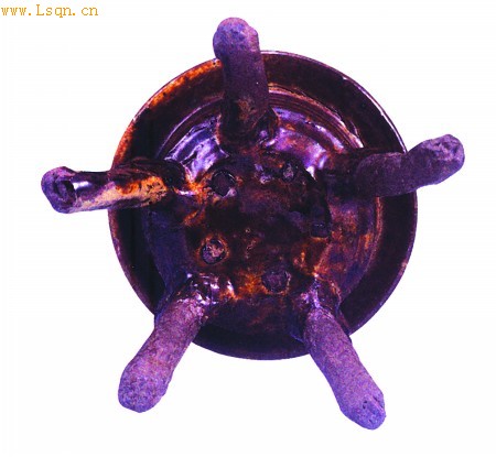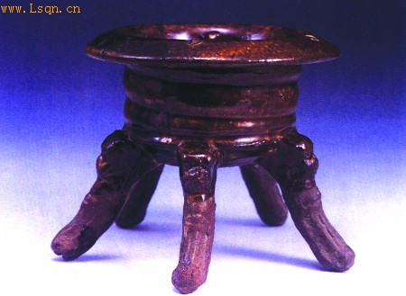 这尊唐代邛窑五足香炉,高11厘米,直径11.5厘米,炉内径6.5厘米,深4.5厘米,褐色釉,光泽莹润,如同凝脂。炉唇外翻,唇宽2厘米,五足向外展开,略显夸张,引人注目,占整个炉身的一半。炉身与足连接处各有一雕塑,形似狮子,按常理应是狻猊。狻猊平生喜静不喜动,好坐,又喜爱烟火,因此佛座上和香炉上的脚部就常以它的造像来装饰。足的下半段为露胎,呈褐红色,胎骨紧密。炉底部留出五处支钉,釉色并不匀称,还有些粗糙,但古拙大方,稚朴可爱,拿在手里有点分量。