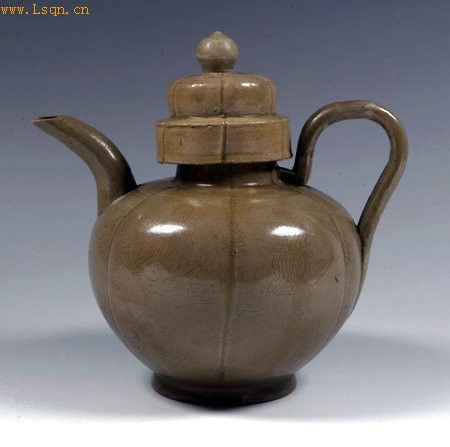 壶短颈,瓜棱形腹,腹部瓜棱与颈部同出,圈足外撇。带盖,盖塔式。双带式曲形把手,直流微曲。颈肩部刻云纹,腹部刻神仙宴乐图,施青釉,釉色偏黄。纹饰清晰,线条流畅,造型端庄秀丽,颇具典雅飘逸之美。此器为秘色瓷。
