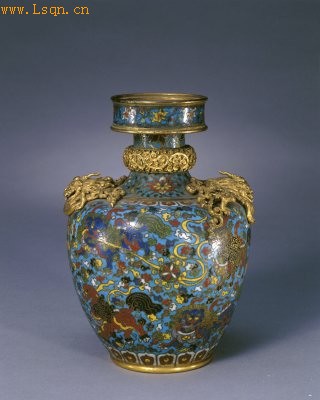 高20cm,口径7.5cm,足径8.2cm。 瓶盘口,短颈,鼓腹,肩部装饰铜镀金錾花螭纹一对,圈足。通体浅蓝色珐琅地,瓶腹饰掐丝狮戏球纹,填红、黄、蓝、赭、绿等色珐琅釉,空间满布彩色祥云纹。足内镌楷书“大明景泰年制”六字款。此藏草瓶花纹布局繁密,为明中期作品,口、颈及镀金錾花装饰系后配。 明代中期,掐丝珐琅器的生产继续发展,并在花纹装饰方面产生了一定的变化,装饰题材更为丰富,狮戏、海马及花鸟纹等比较流行,但作品表面气泡增加,反映出珐琅质量的下降。