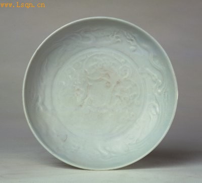盘敞口,浅弧壁,圈足。胎体洁白,里外施卵白釉。内底及内壁均模印云龙纹。